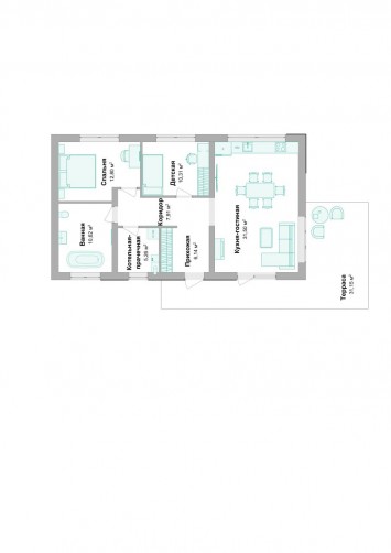Дом предназначен для небольшой семьи. Внутреннее пространство дома функционально спланировано и разделено на две спальни, просторные кухню-гостиную и ванную комнату. Потолок в гостиной имеет переменную высоту от 2,9 до 4,5 м, а соразмерное окно создает ощущение простора и воздуха в помещении и сравнимо со «вторым светом». Этот проект идеально подойдёт для всех, кто предпочитает простые, функциональные и экономичные решения при выборе дома.