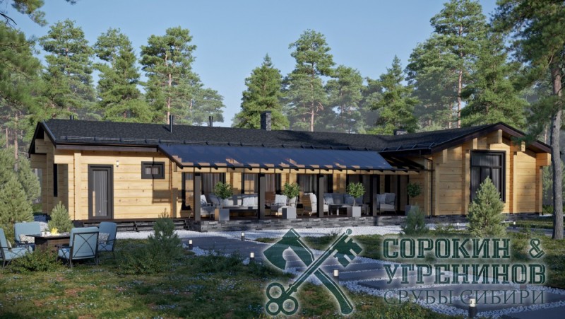 Индивидуальный проект одноэтажного жилого дома из лафета сечением 250х400мм. Общая площадь дома 305м2. Большой дом имеет т-образную форму, и два выхода на террасы, четыре спальные комнаты, три санузла, гардеробная, котельная, большая гостиная с камином, прачечная, кладовая.